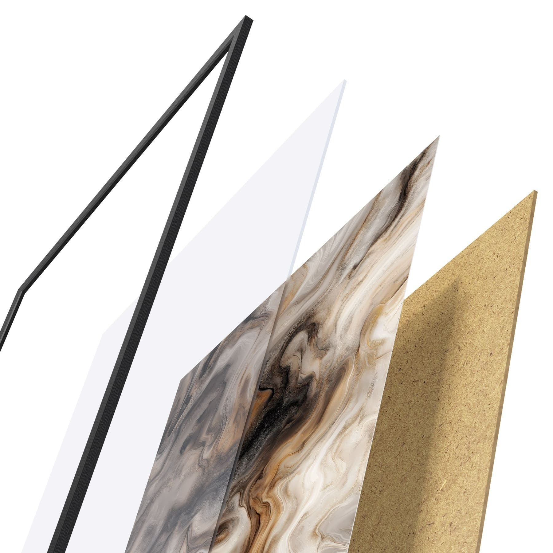 De poster bestaat uit een frame, plexiglas, geprinte afbeelding en spaanplaat achterkant. De poster kan meteen aan de muur worden gehangen dankzij de bevestigingen op de achterkant.