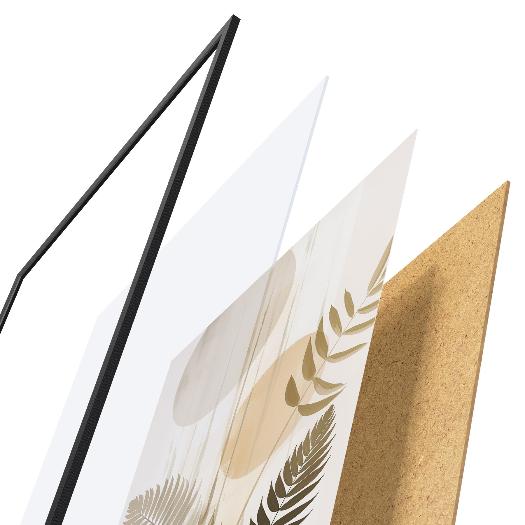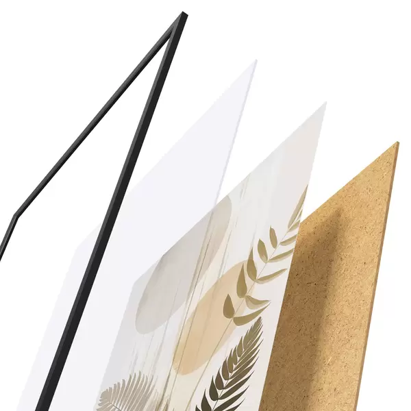 De poster bestaat uit een frame, plexiglas, geprinte afbeelding en spaanplaat achterkant. De poster kan meteen aan de muur worden gehangen dankzij de bevestigingen op de achterkant.