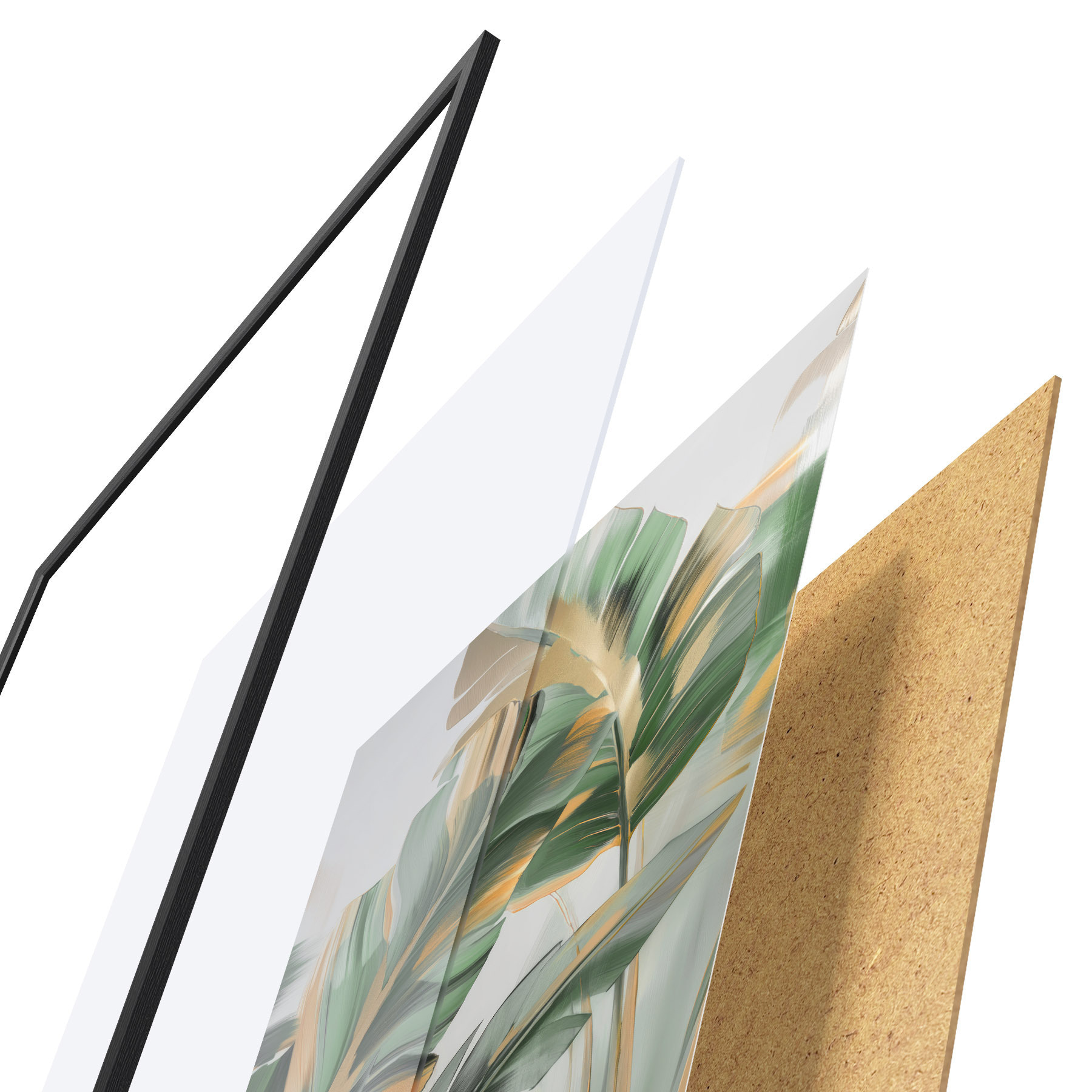 De poster bestaat uit een frame, plexiglas, geprinte afbeelding en spaanplaat achterkant. De poster kan meteen aan de muur worden gehangen dankzij de bevestigingen op de achterkant.