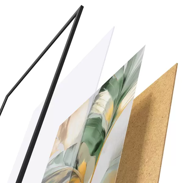 De poster bestaat uit een frame, plexiglas, geprinte afbeelding en spaanplaat achterkant. De poster kan meteen aan de muur worden gehangen dankzij de bevestigingen op de achterkant.