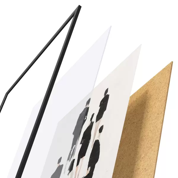 De poster bestaat uit een frame, plexiglas, geprinte afbeelding en spaanplaat achterkant. De poster kan meteen aan de muur worden gehangen dankzij de bevestigingen op de achterkant.