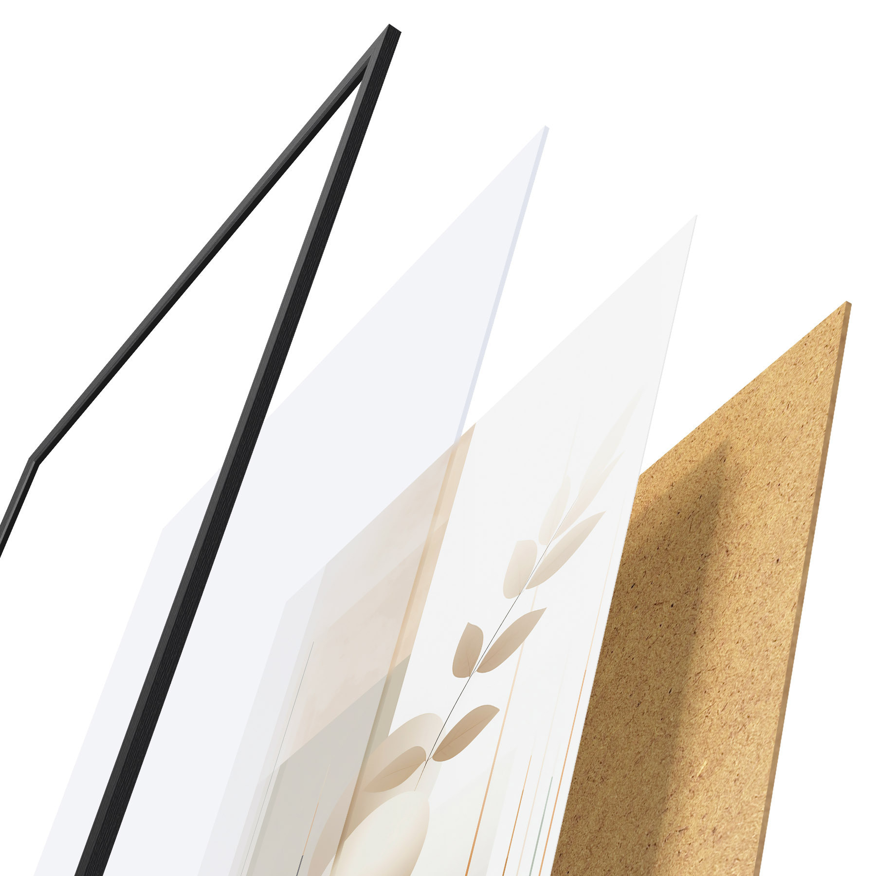 De poster bestaat uit een frame, plexiglas, geprinte afbeelding en spaanplaat achterkant. De poster kan meteen aan de muur worden gehangen dankzij de bevestigingen op de achterkant.