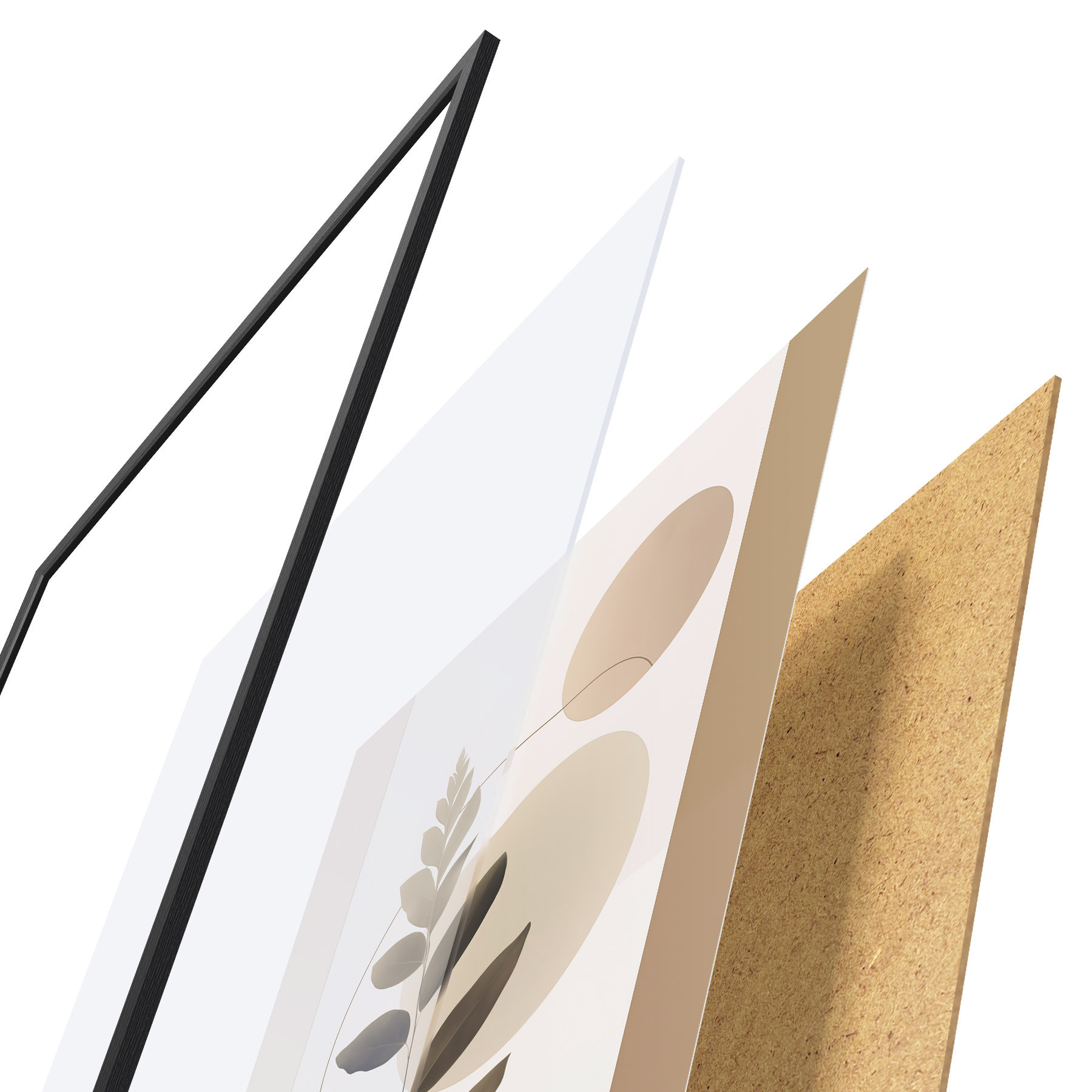 De poster bestaat uit een frame, plexiglas, geprinte afbeelding en spaanplaat achterkant. De poster kan meteen aan de muur worden gehangen dankzij de bevestigingen op de achterkant.