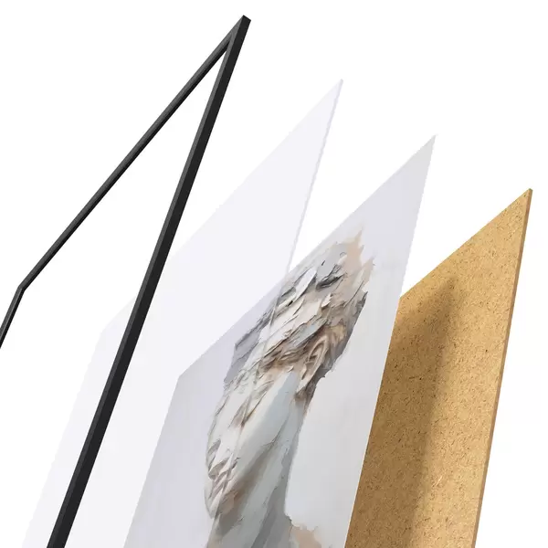 De poster bestaat uit een frame, plexiglas, geprinte afbeelding en spaanplaat achterkant. De poster kan meteen aan de muur worden gehangen dankzij de bevestigingen op de achterkant.