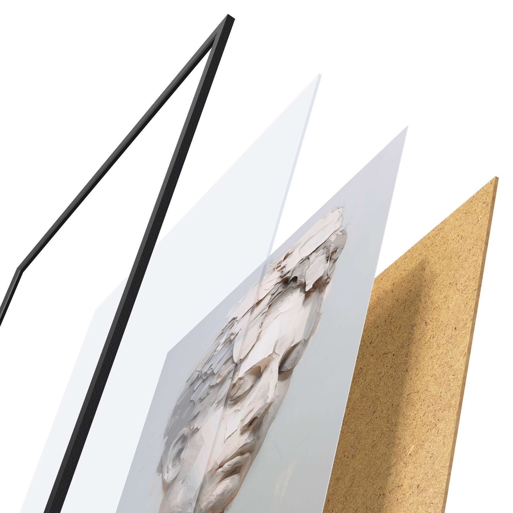 De poster bestaat uit een frame, plexiglas, geprinte afbeelding en spaanplaat achterkant. De poster kan meteen aan de muur worden gehangen dankzij de bevestigingen op de achterkant.