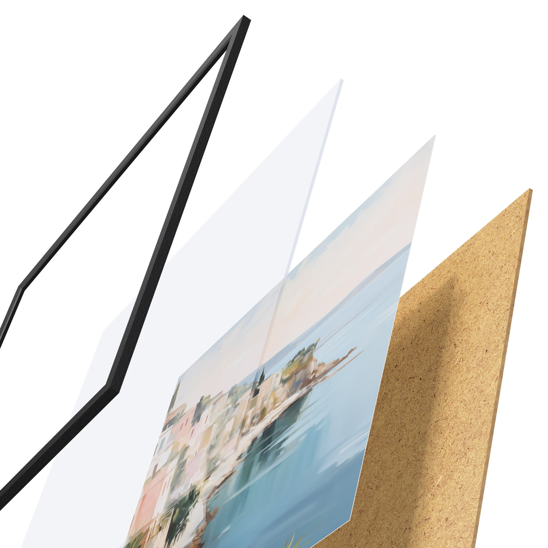 De poster bestaat uit een frame, plexiglas, geprinte afbeelding en spaanplaat achterkant. De poster kan meteen aan de muur worden gehangen dankzij de bevestigingen op de achterkant.