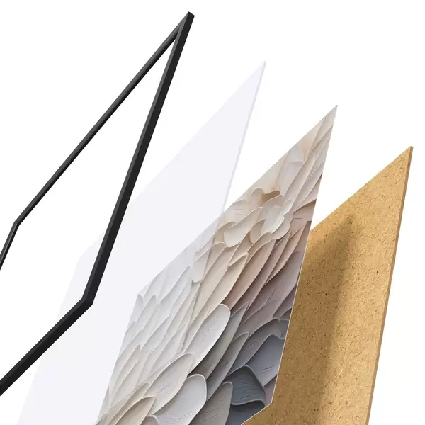 De poster bestaat uit een frame, plexiglas, geprinte afbeelding en spaanplaat achterkant. De poster kan meteen aan de muur worden gehangen dankzij de bevestigingen op de achterkant.