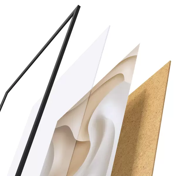 De poster bestaat uit een frame, plexiglas, geprinte afbeelding en spaanplaat achterkant. De poster kan meteen aan de muur worden gehangen dankzij de bevestigingen op de achterkant.