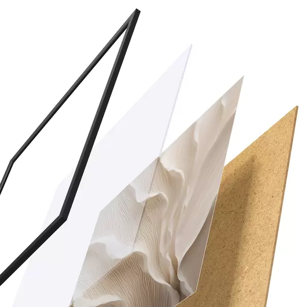 De poster bestaat uit een frame, plexiglas, geprinte afbeelding en spaanplaat achterkant. De poster kan meteen aan de muur worden gehangen dankzij de bevestigingen op de achterkant.