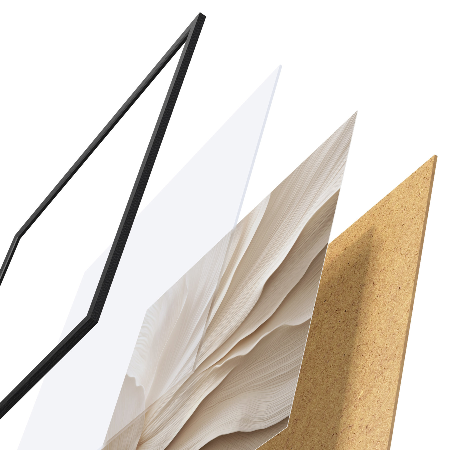 De poster bestaat uit een frame, plexiglas, geprinte afbeelding en spaanplaat achterkant. De poster kan meteen aan de muur worden gehangen dankzij de bevestigingen op de achterkant.