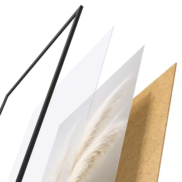 De poster bestaat uit een frame, plexiglas, geprinte afbeelding en spaanplaat achterkant. De poster kan meteen aan de muur worden gehangen dankzij de bevestigingen op de achterkant.
