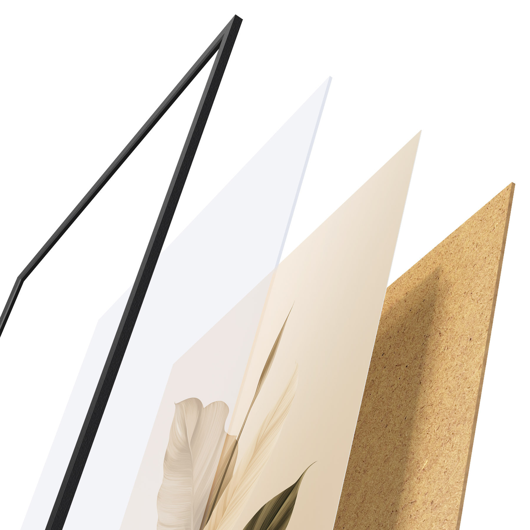 De poster bestaat uit een frame, plexiglas, geprinte afbeelding en spaanplaat achterkant. De poster kan meteen aan de muur worden gehangen dankzij de bevestigingen op de achterkant.