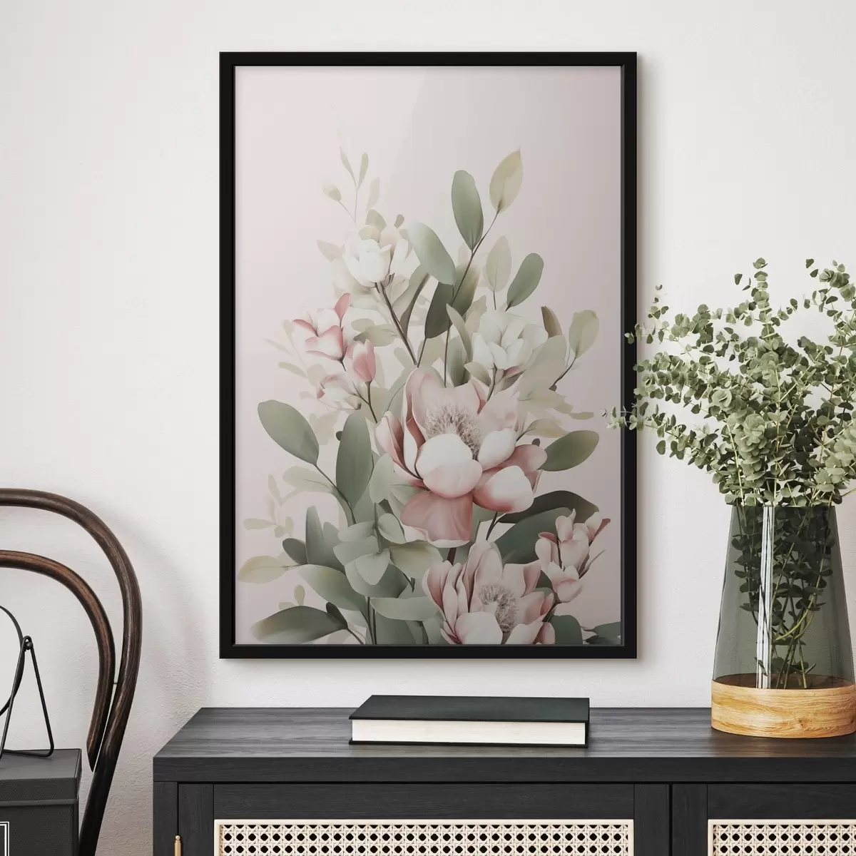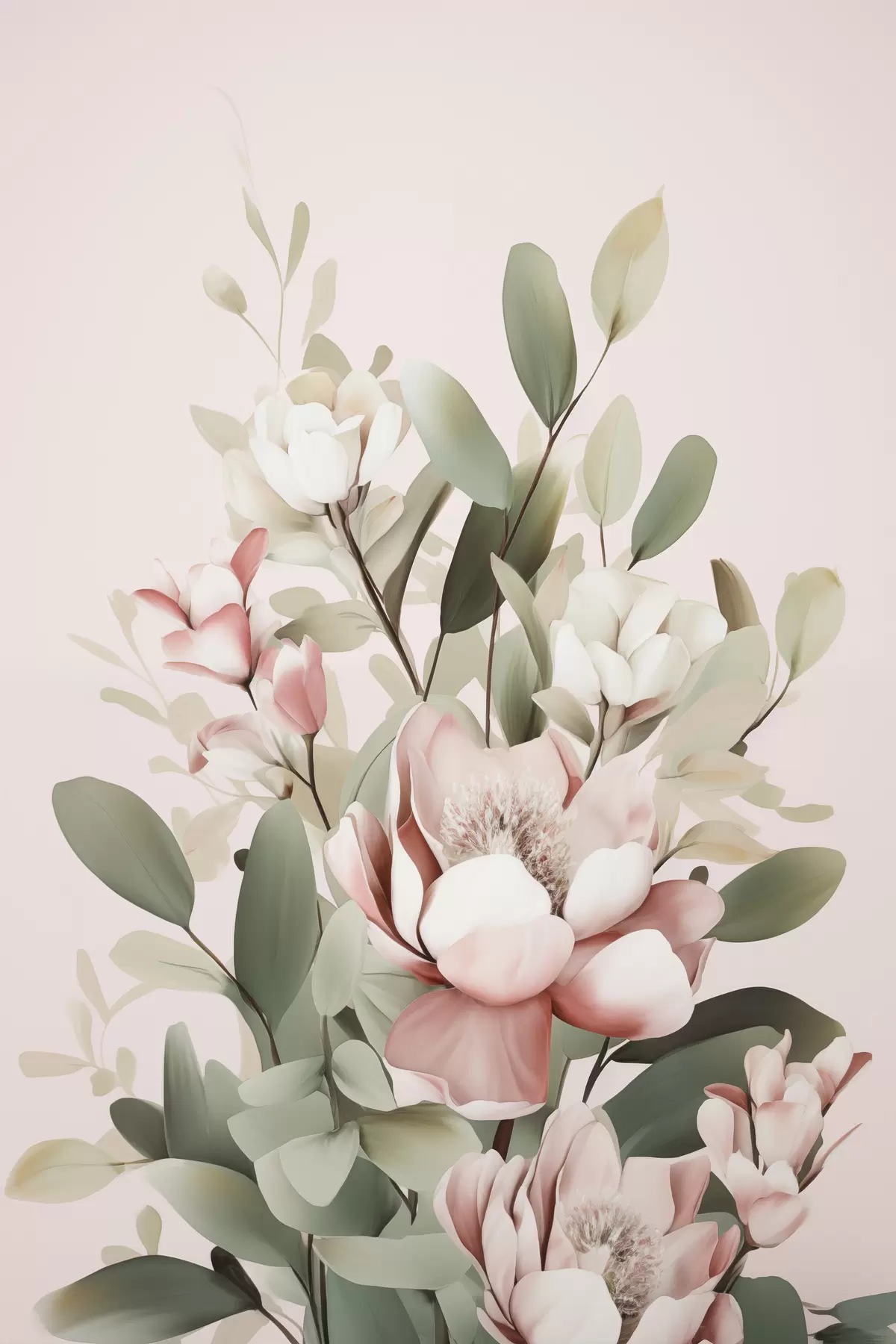 Poster Een boeket pastelkleurige bloemen met eucalyptusbladeren, op een lichtroze achtergrond Nr f48727