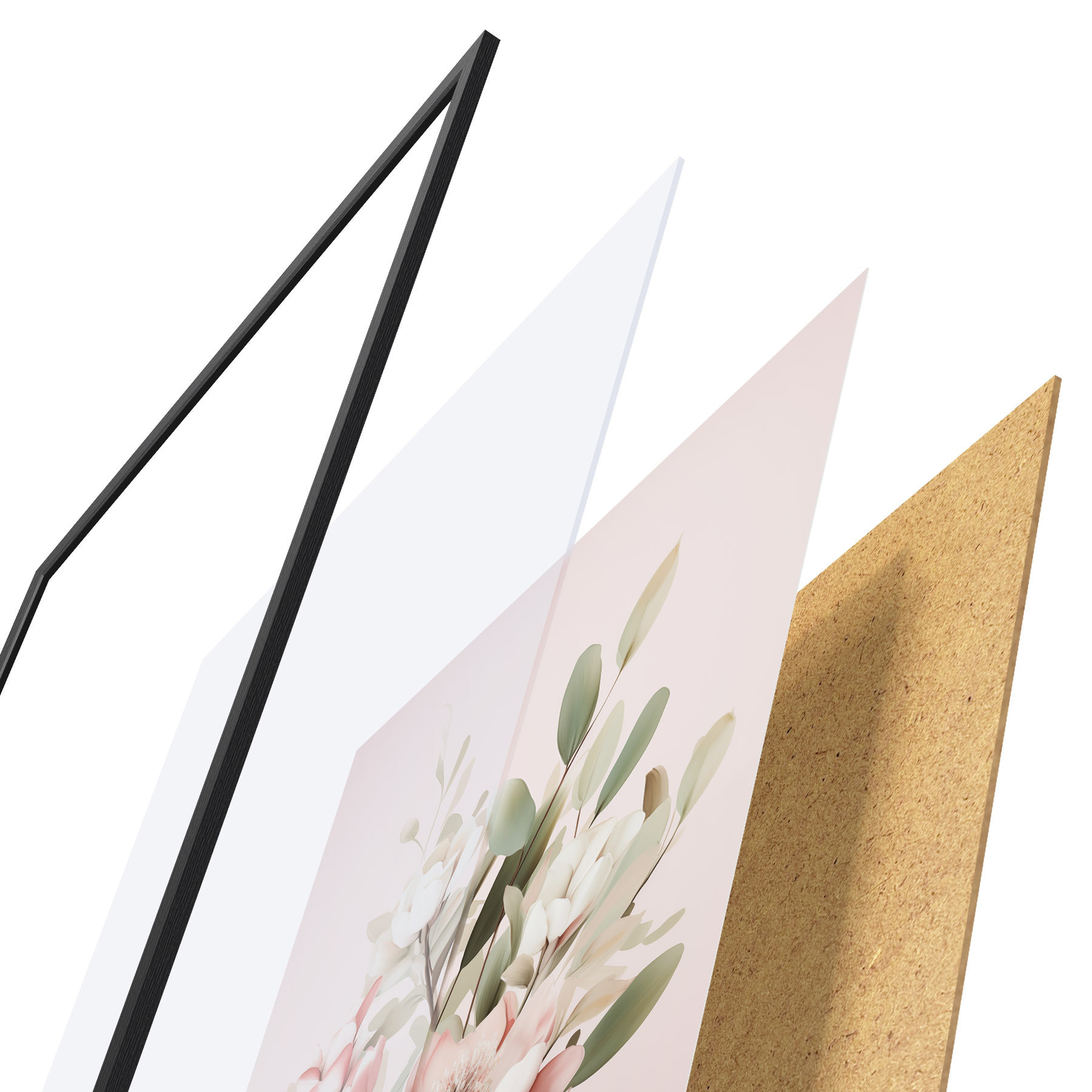 De poster bestaat uit een frame, plexiglas, geprinte afbeelding en spaanplaat achterkant. De poster kan meteen aan de muur worden gehangen dankzij de bevestigingen op de achterkant.