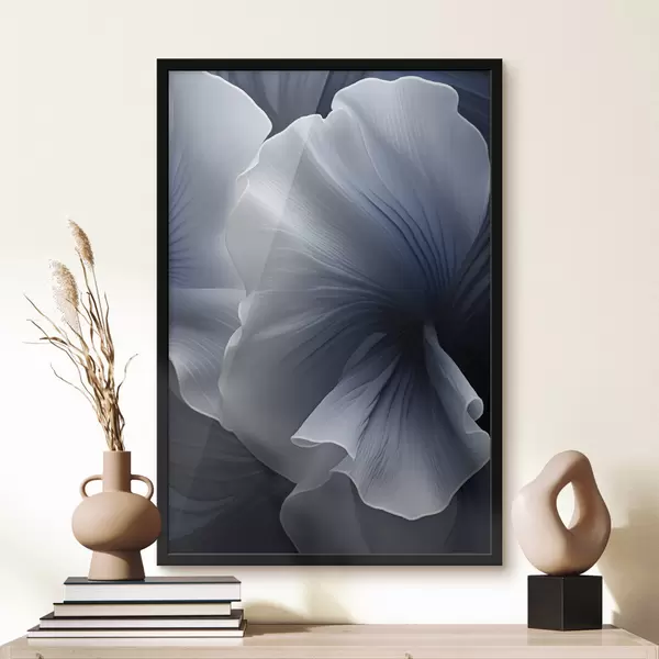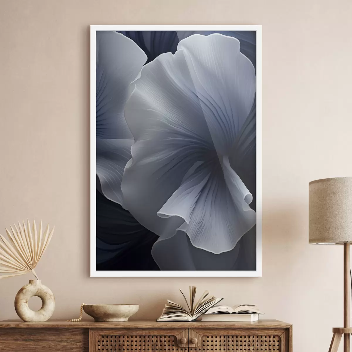 Poster Abstracte blauw-witte bloemblaadjes tegen een donkere achtergrond Nr f48731