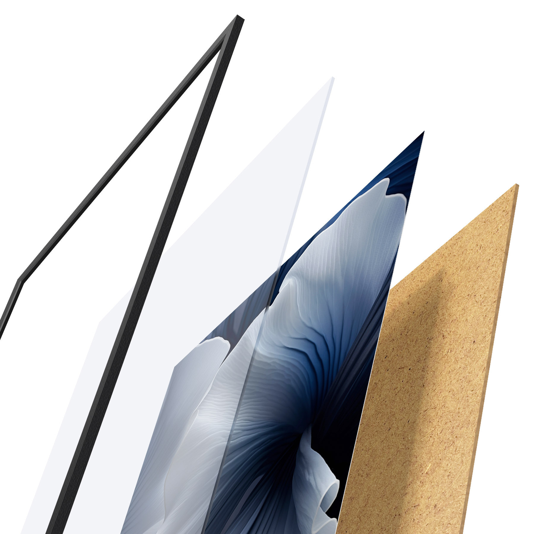 De poster bestaat uit een frame, plexiglas, geprinte afbeelding en spaanplaat achterkant. De poster kan meteen aan de muur worden gehangen dankzij de bevestigingen op de achterkant.
