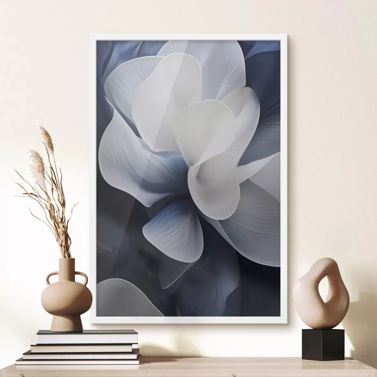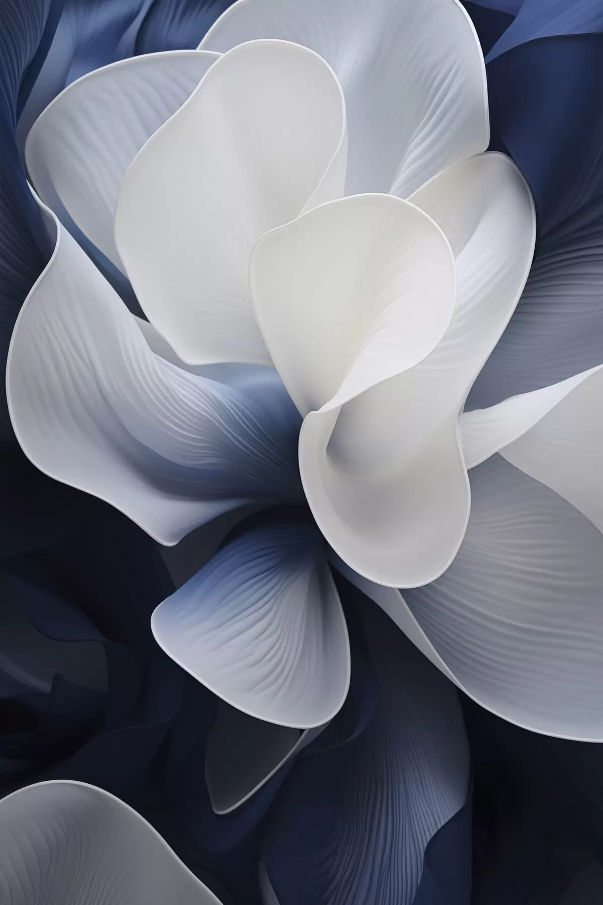 Poster Abstracte blauw-witte bloemblaadjes tegen een donkere achtergrond Nr f48732