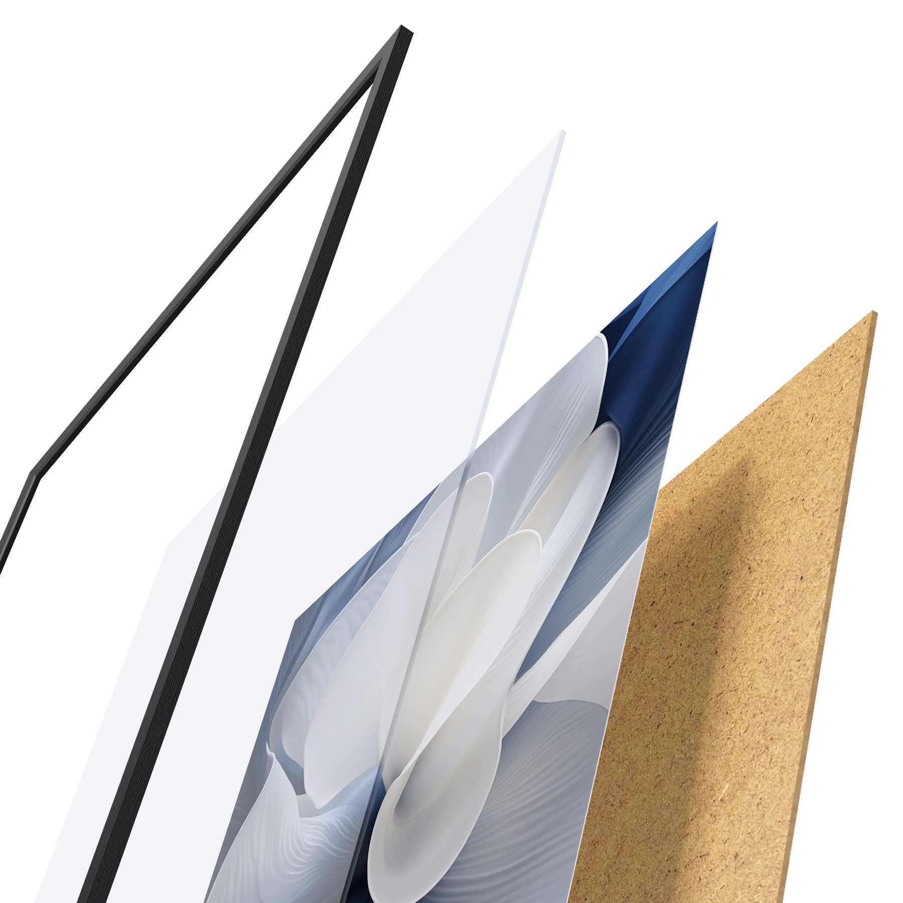 De poster bestaat uit een frame, plexiglas, geprinte afbeelding en spaanplaat achterkant. De poster kan meteen aan de muur worden gehangen dankzij de bevestigingen op de achterkant.