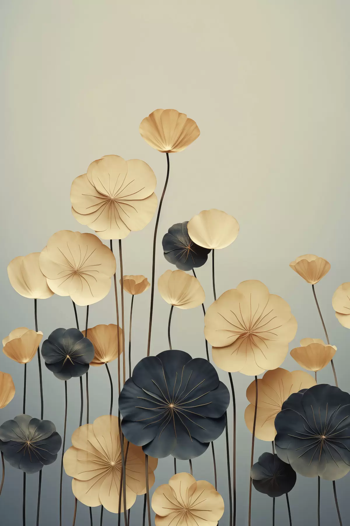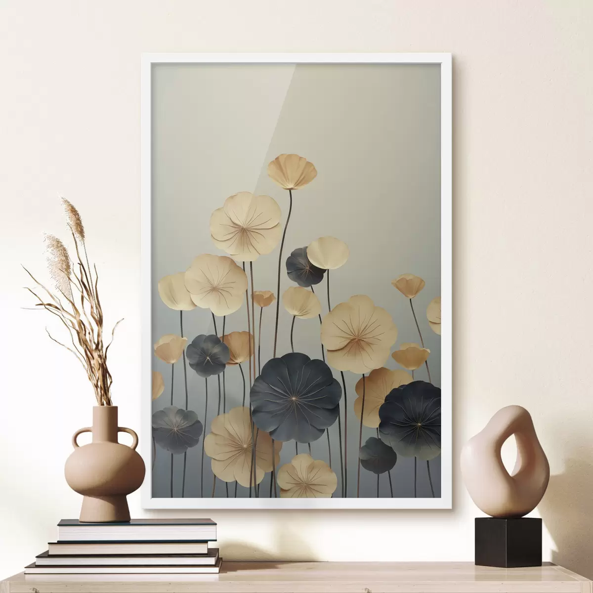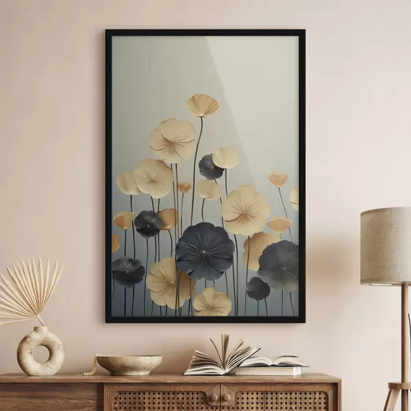 Poster Waterlelieblaadjes tegen een ingetogen achtergrond van beige en donkerblauw Nr f48734
