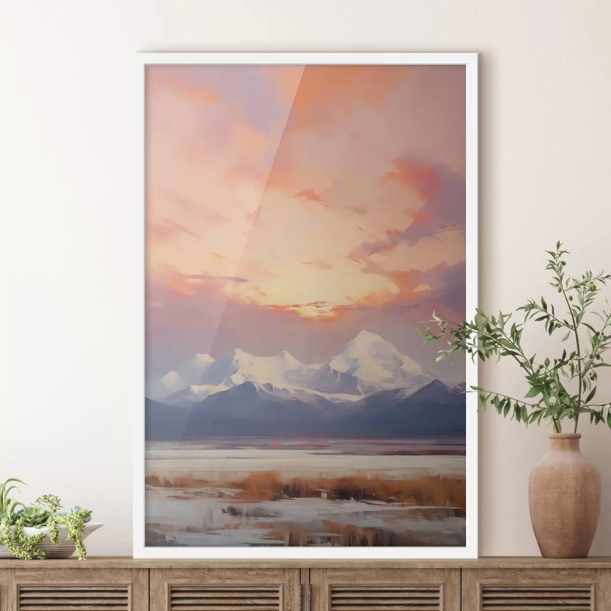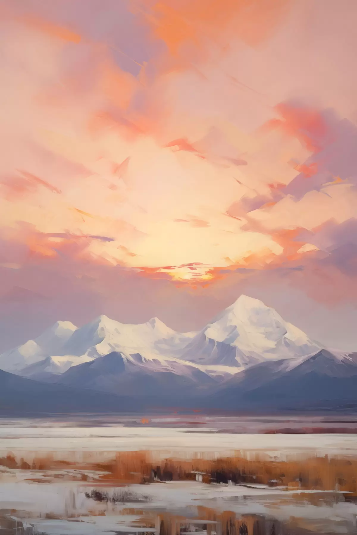 Poster Met sneeuw bedekte bergen onder een levendige oranje en roze lucht met wolken Nr f48742