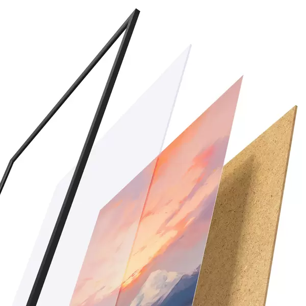 De poster bestaat uit een frame, plexiglas, geprinte afbeelding en spaanplaat achterkant. De poster kan meteen aan de muur worden gehangen dankzij de bevestigingen op de achterkant.