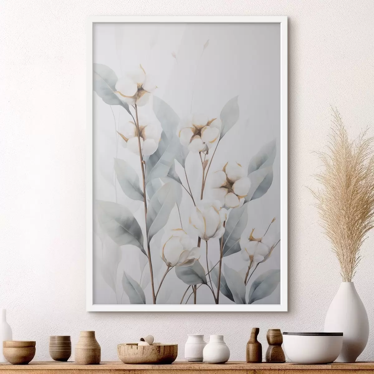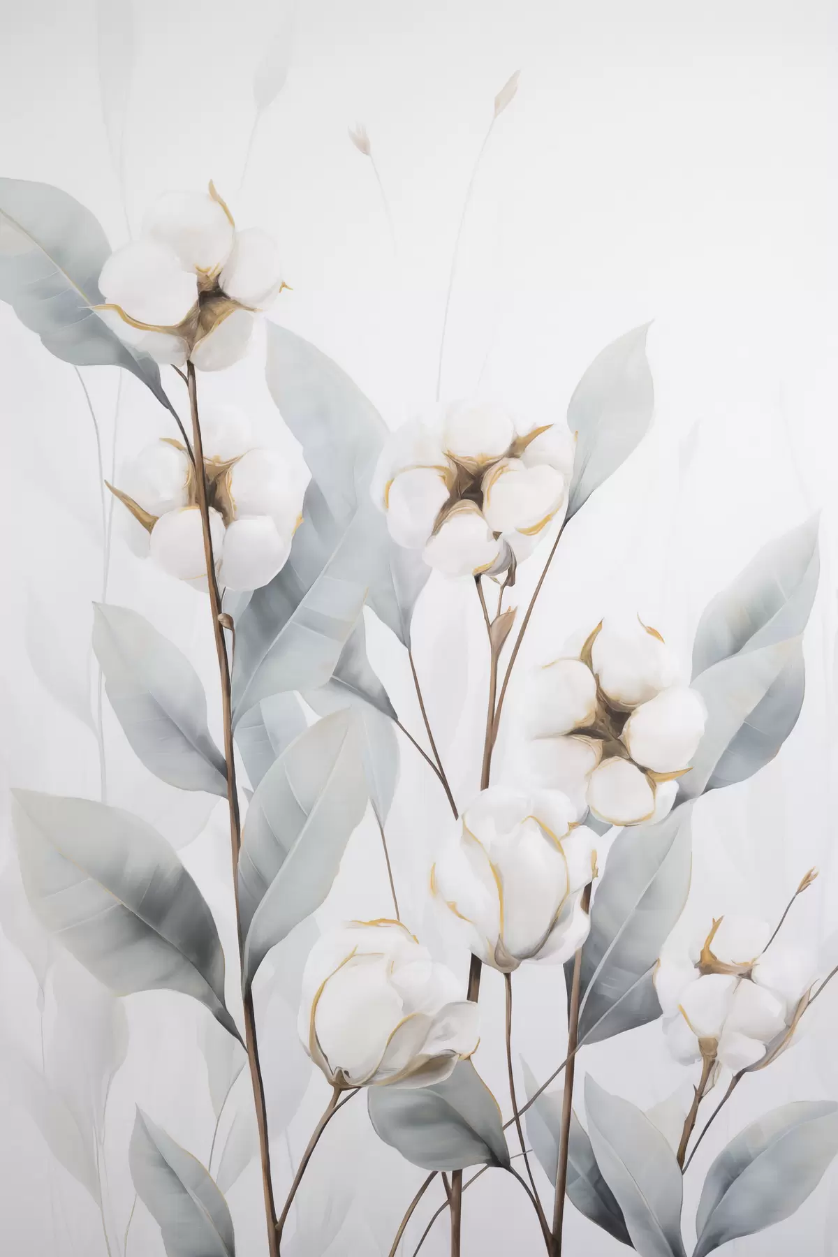 Poster Een witte katoenplant met lichtblauwgroene bladeren tegen een lichte achtergrond Nr f48744