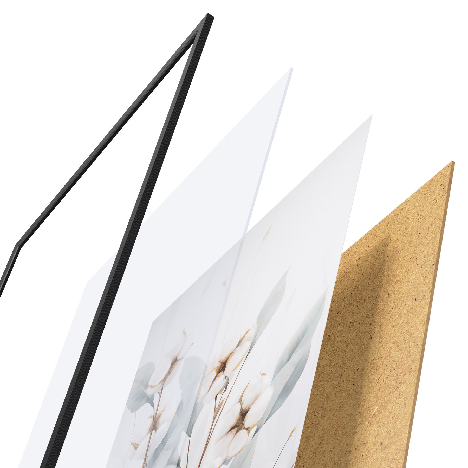 De poster bestaat uit een frame, plexiglas, geprinte afbeelding en spaanplaat achterkant. De poster kan meteen aan de muur worden gehangen dankzij de bevestigingen op de achterkant.
