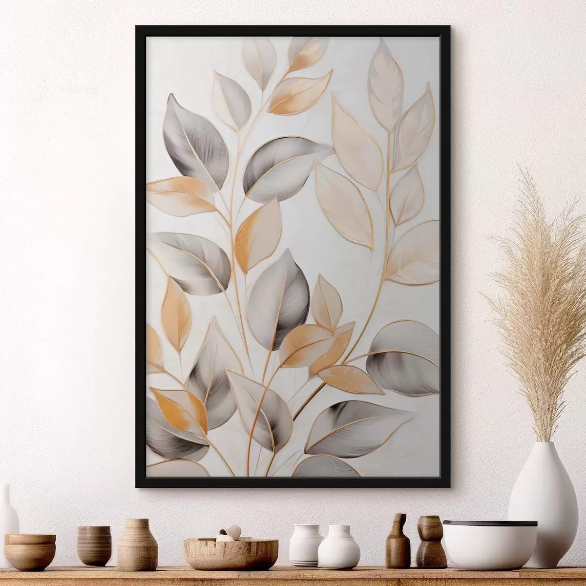 Poster Grote, doorschijnende bladeren in grijze en gele tinten f48746
