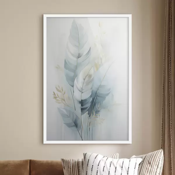 Poster Grote, zachte veren in blauw- en wittinten met delicate beige blaadjes Nr f48749