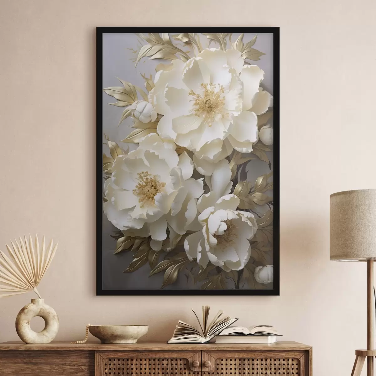 Poster Grote witte pioenrozen met gele bladeren tegen een grijze achtergrond Nr f48754