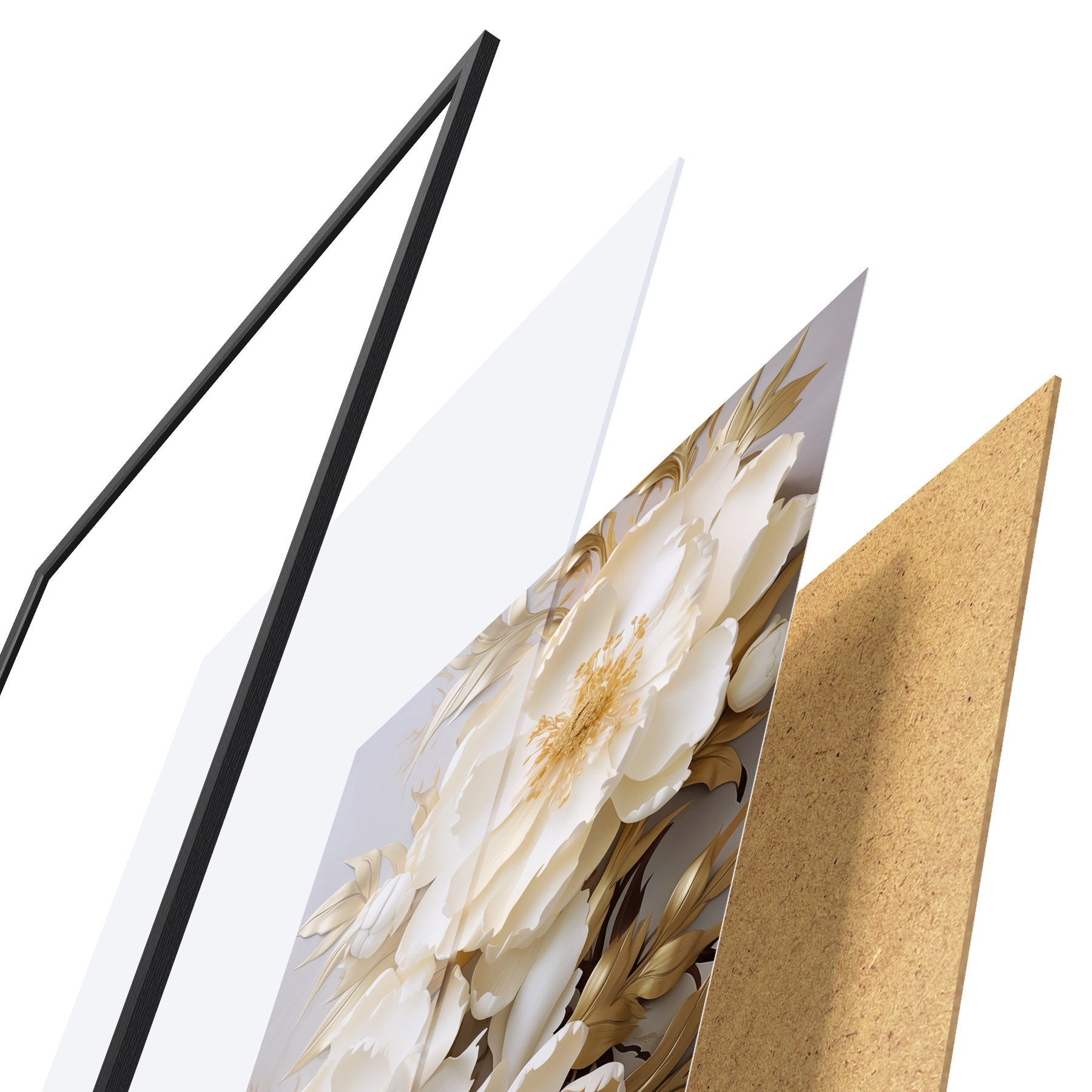De poster bestaat uit een frame, plexiglas, geprinte afbeelding en spaanplaat achterkant. De poster kan meteen aan de muur worden gehangen dankzij de bevestigingen op de achterkant.