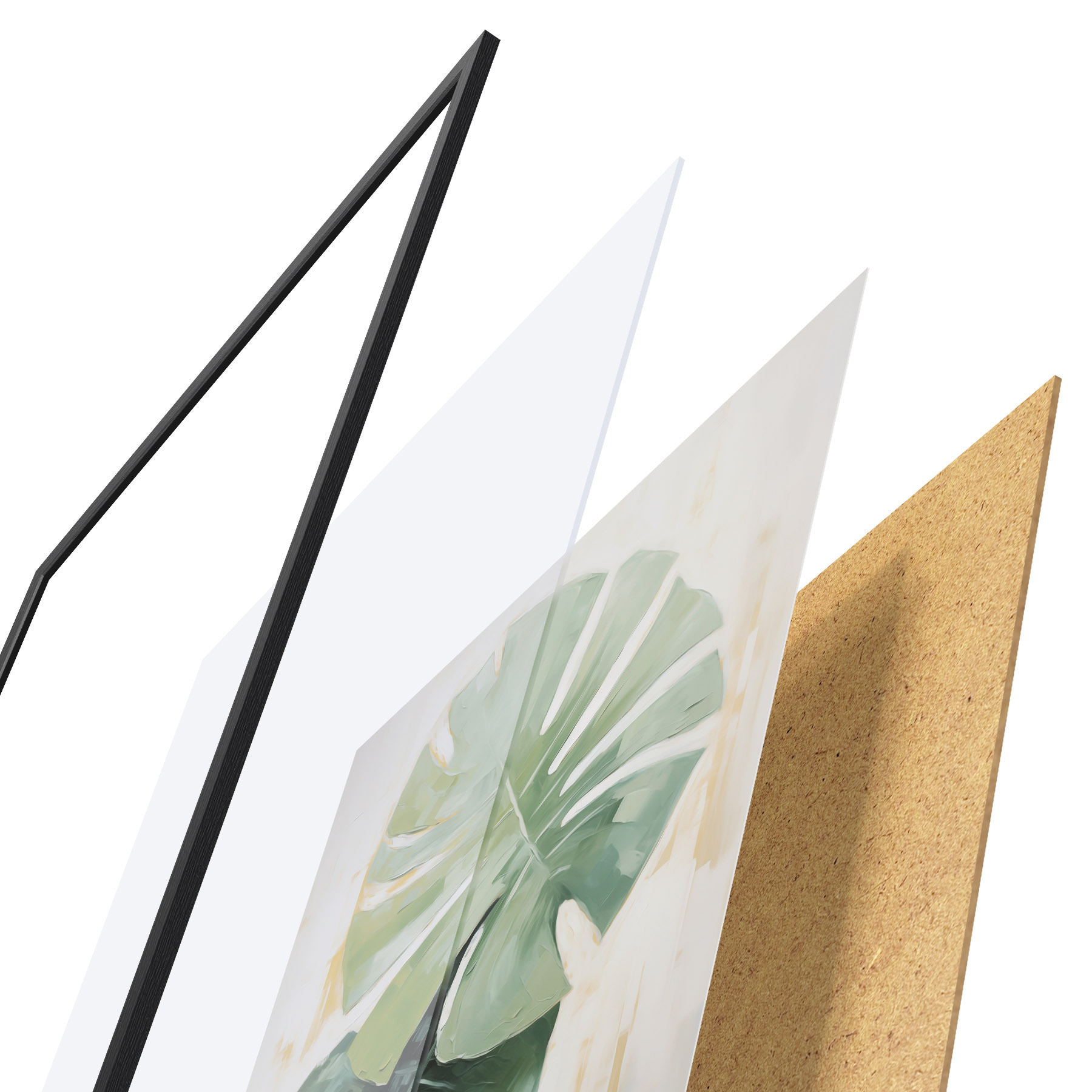 De poster bestaat uit een frame, plexiglas, geprinte afbeelding en spaanplaat achterkant. De poster kan meteen aan de muur worden gehangen dankzij de bevestigingen op de achterkant.