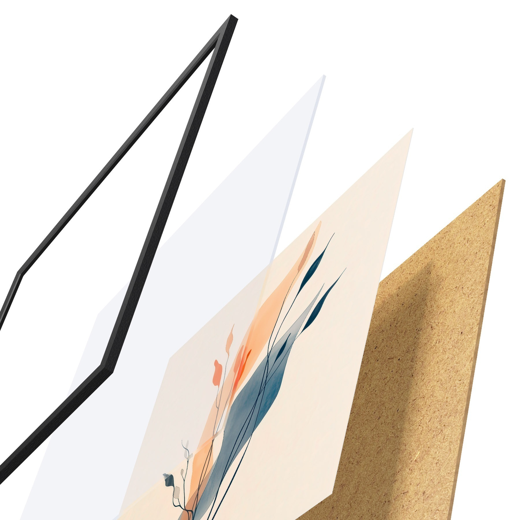 De poster bestaat uit een frame, plexiglas, geprinte afbeelding en spaanplaat achterkant. De poster kan meteen aan de muur worden gehangen dankzij de bevestigingen op de achterkant.