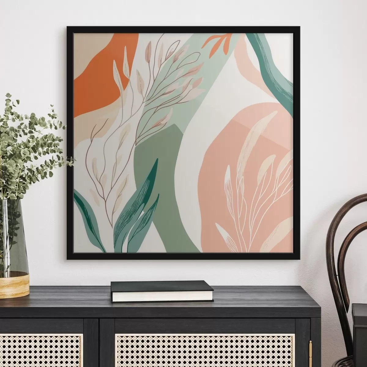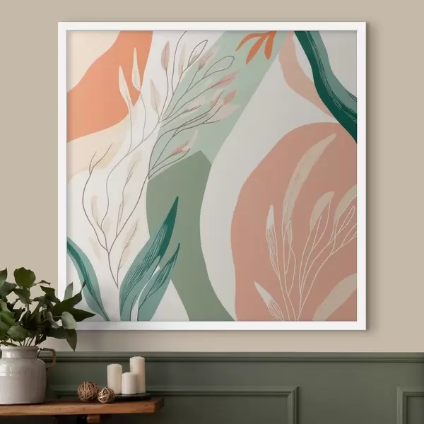 Poster Botanische kunst met zachte vormen in een koraalgroen kleurenpalet f48840