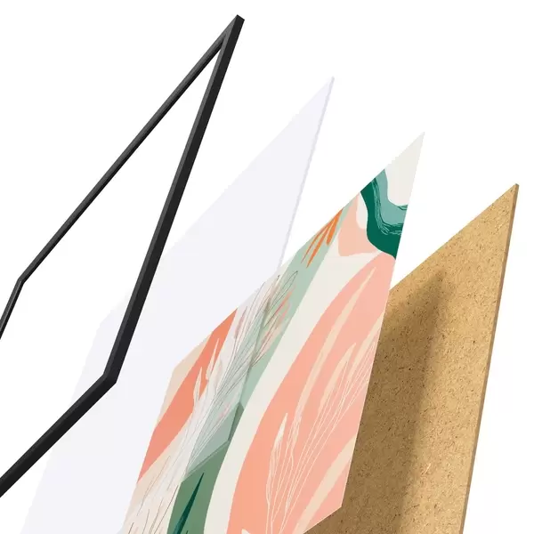 De poster bestaat uit een frame, plexiglas, geprinte afbeelding en spaanplaat achterkant. De poster kan meteen aan de muur worden gehangen dankzij de bevestigingen op de achterkant.