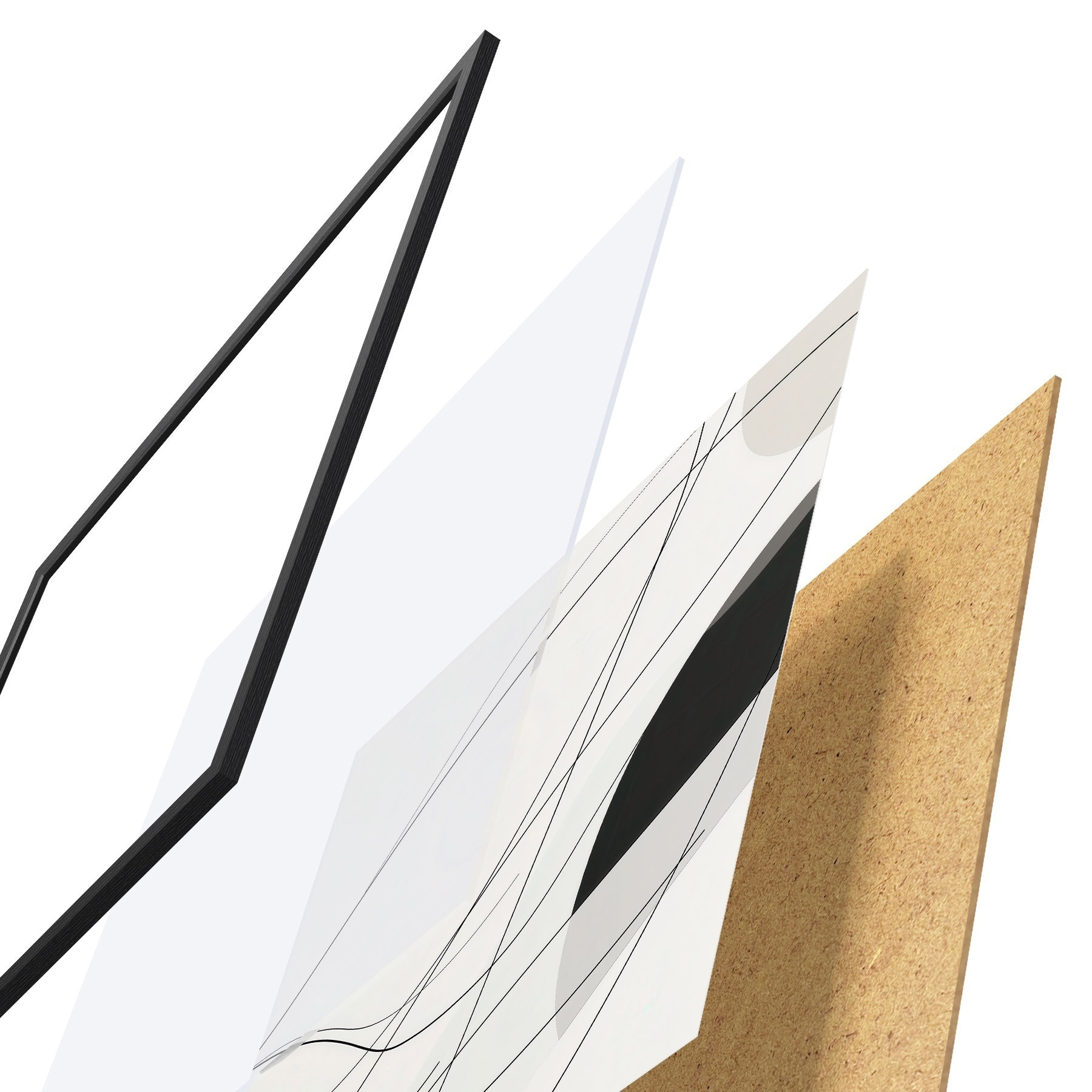 De poster bestaat uit een frame, plexiglas, geprinte afbeelding en spaanplaat achterkant. De poster kan meteen aan de muur worden gehangen dankzij de bevestigingen op de achterkant.