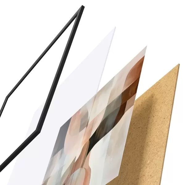 De poster bestaat uit een frame, plexiglas, geprinte afbeelding en spaanplaat achterkant. De poster kan meteen aan de muur worden gehangen dankzij de bevestigingen op de achterkant.