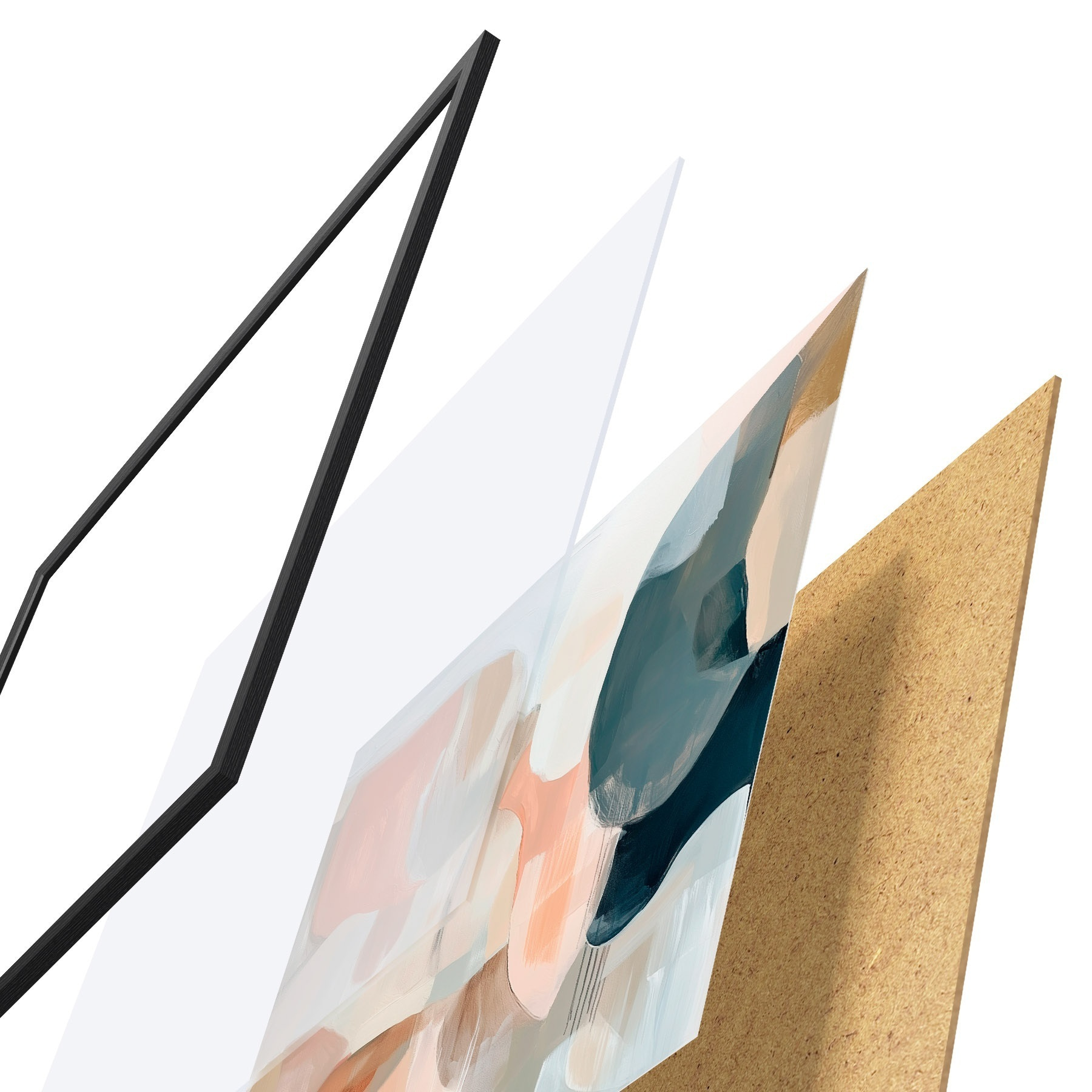 De poster bestaat uit een frame, plexiglas, geprinte afbeelding en spaanplaat achterkant. De poster kan meteen aan de muur worden gehangen dankzij de bevestigingen op de achterkant.