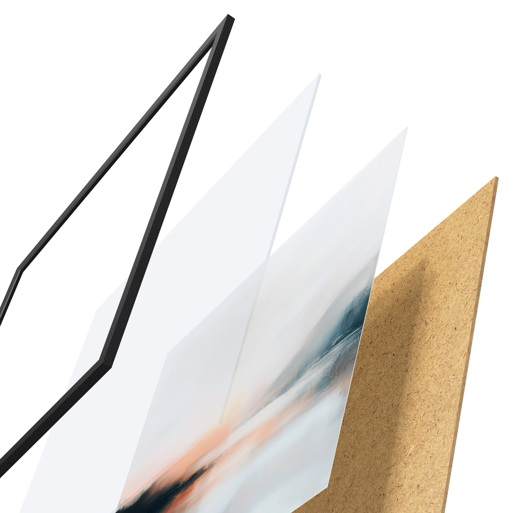 De poster bestaat uit een frame, plexiglas, geprinte afbeelding en spaanplaat achterkant. De poster kan meteen aan de muur worden gehangen dankzij de bevestigingen op de achterkant.