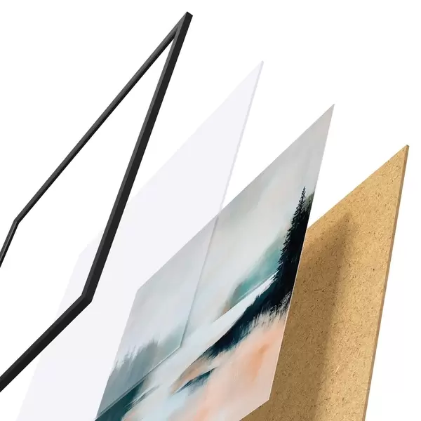 De poster bestaat uit een frame, plexiglas, geprinte afbeelding en spaanplaat achterkant. De poster kan meteen aan de muur worden gehangen dankzij de bevestigingen op de achterkant.