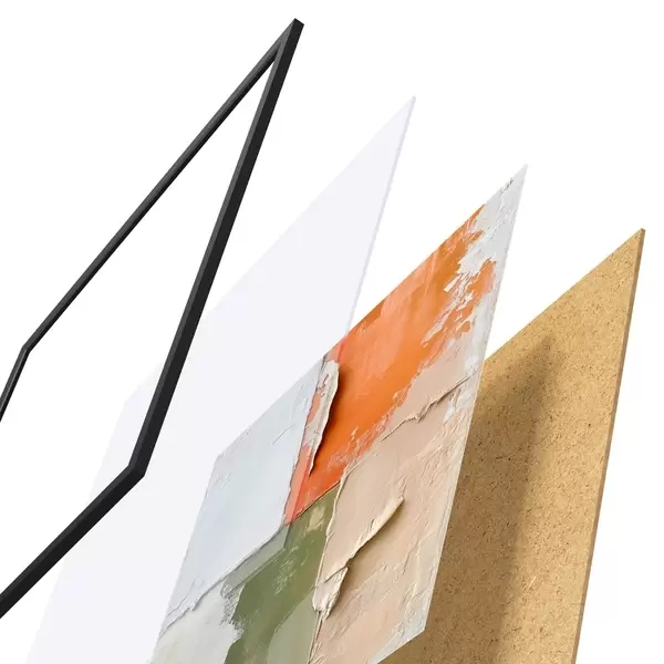 De poster bestaat uit een frame, plexiglas, geprinte afbeelding en spaanplaat achterkant. De poster kan meteen aan de muur worden gehangen dankzij de bevestigingen op de achterkant.