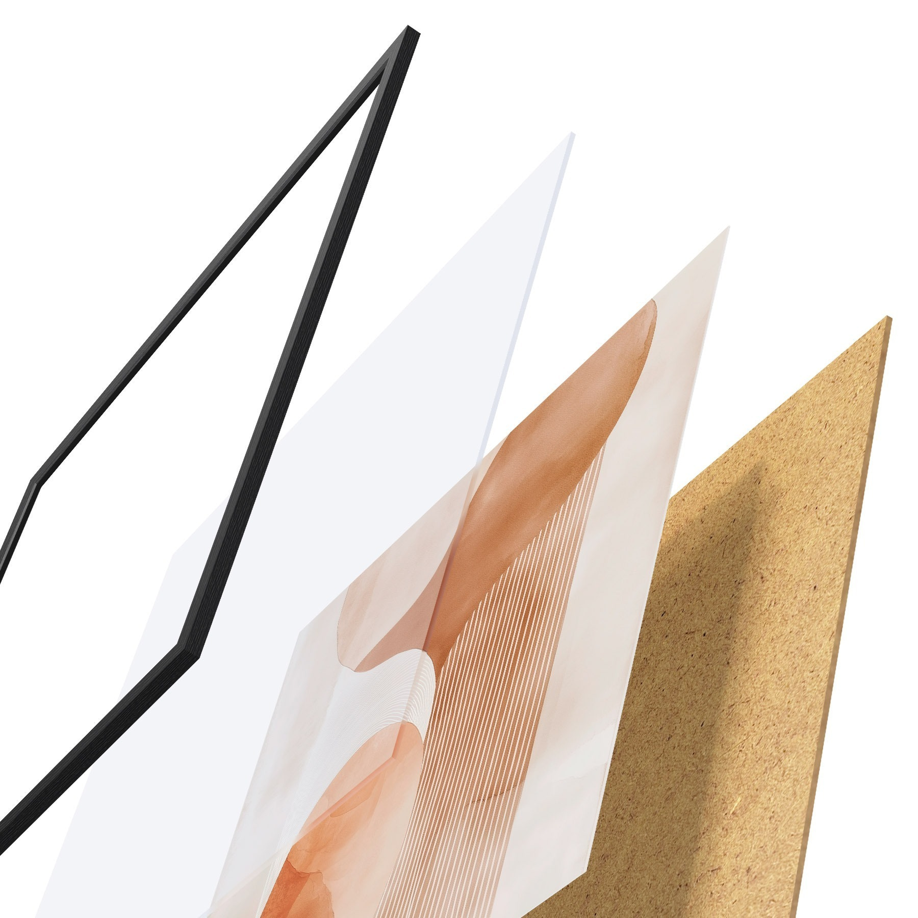 De poster bestaat uit een frame, plexiglas, geprinte afbeelding en spaanplaat achterkant. De poster kan meteen aan de muur worden gehangen dankzij de bevestigingen op de achterkant.