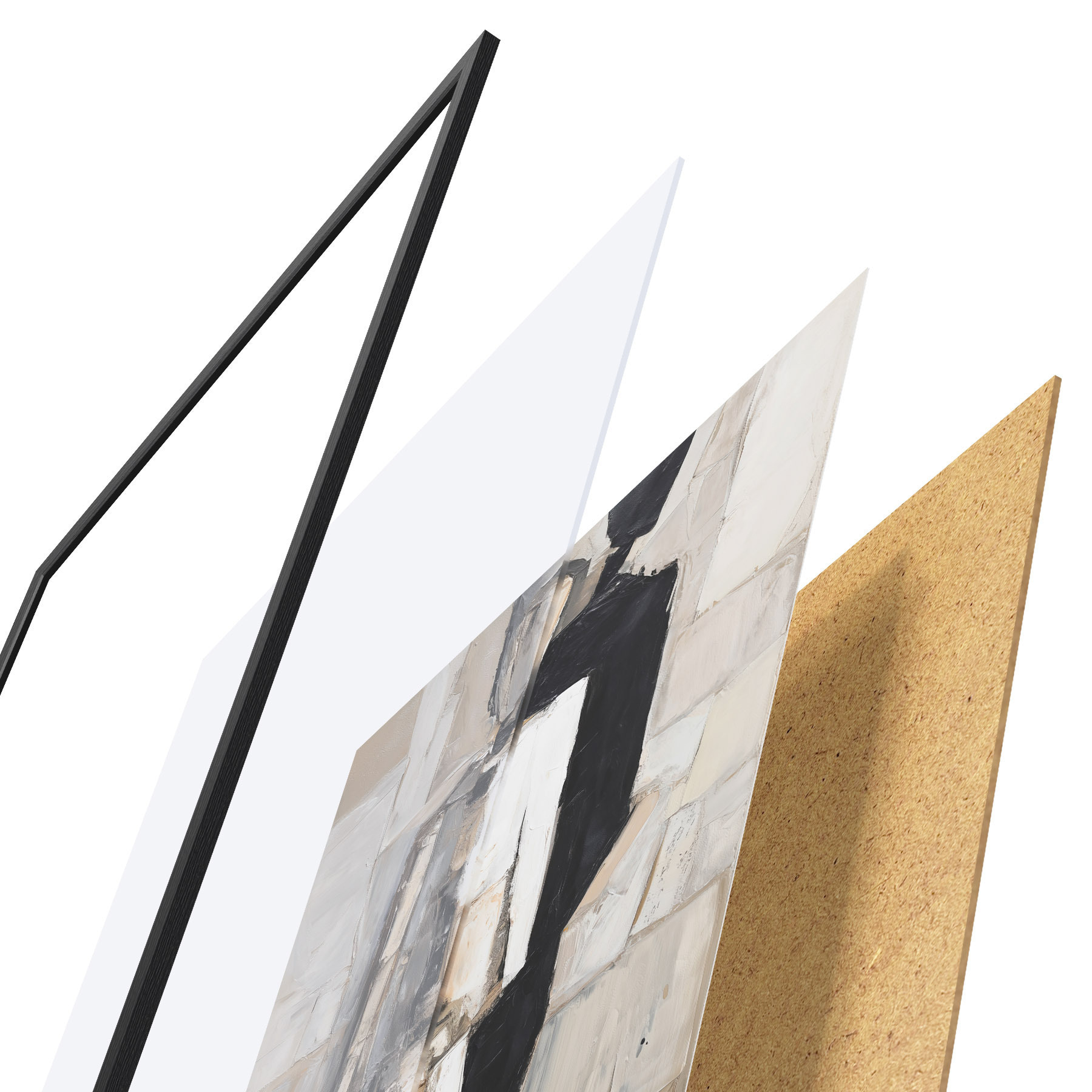 De poster bestaat uit een frame, plexiglas, geprinte afbeelding en spaanplaat achterkant. De poster kan meteen aan de muur worden gehangen dankzij de bevestigingen op de achterkant.