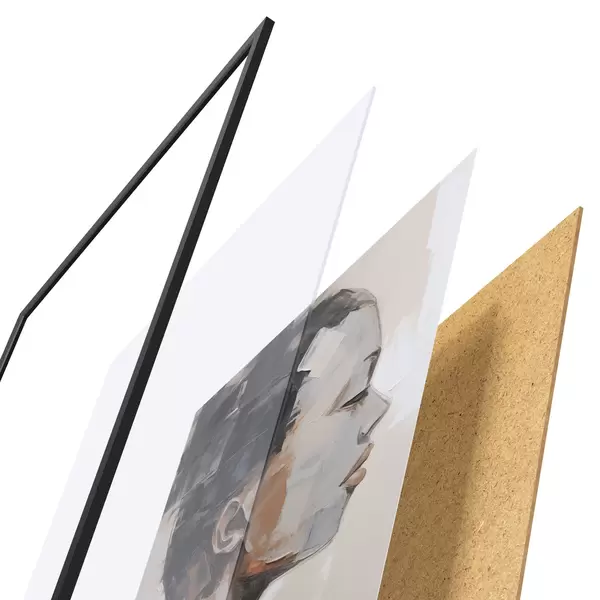 De poster bestaat uit een frame, plexiglas, geprinte afbeelding en spaanplaat achterkant. De poster kan meteen aan de muur worden gehangen dankzij de bevestigingen op de achterkant.