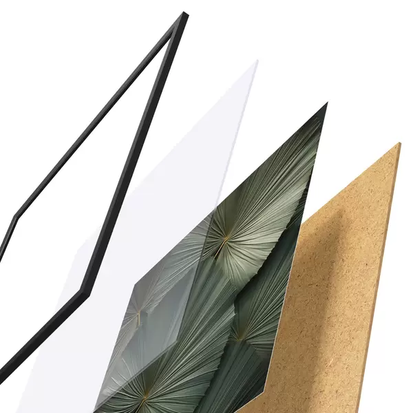 De poster bestaat uit een frame, plexiglas, geprinte afbeelding en spaanplaat achterkant. De poster kan meteen aan de muur worden gehangen dankzij de bevestigingen op de achterkant.