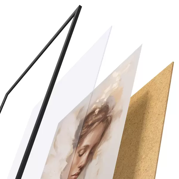 De poster bestaat uit een frame, plexiglas, geprinte afbeelding en spaanplaat achterkant. De poster kan meteen aan de muur worden gehangen dankzij de bevestigingen op de achterkant.