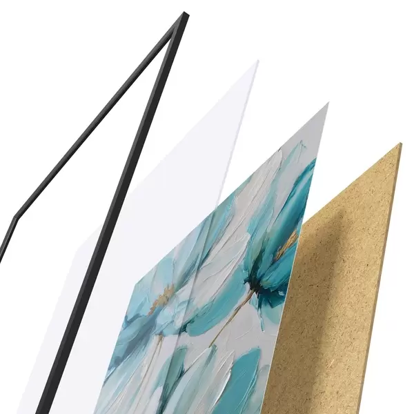 De poster bestaat uit een frame, plexiglas, geprinte afbeelding en spaanplaat achterkant. De poster kan meteen aan de muur worden gehangen dankzij de bevestigingen op de achterkant.