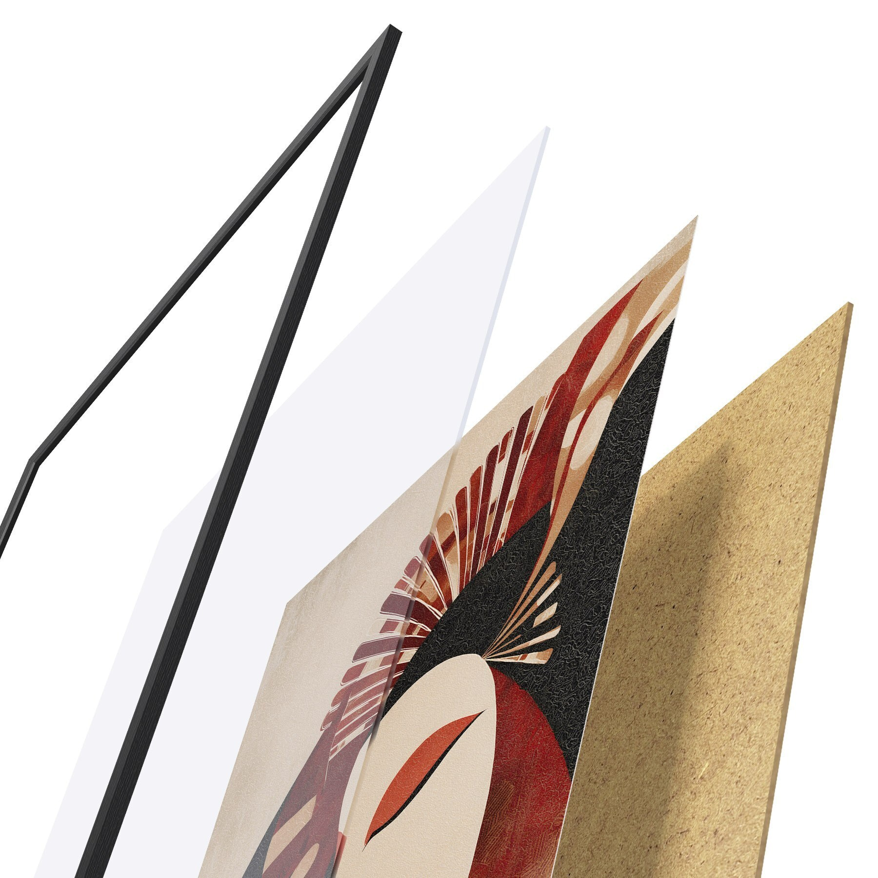 De poster bestaat uit een frame, plexiglas, geprinte afbeelding en spaanplaat achterkant. De poster kan meteen aan de muur worden gehangen dankzij de bevestigingen op de achterkant.