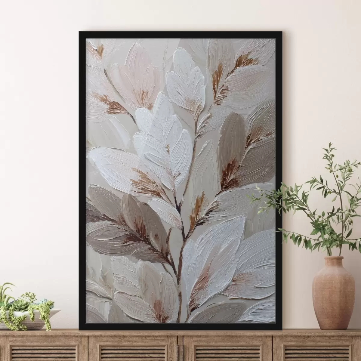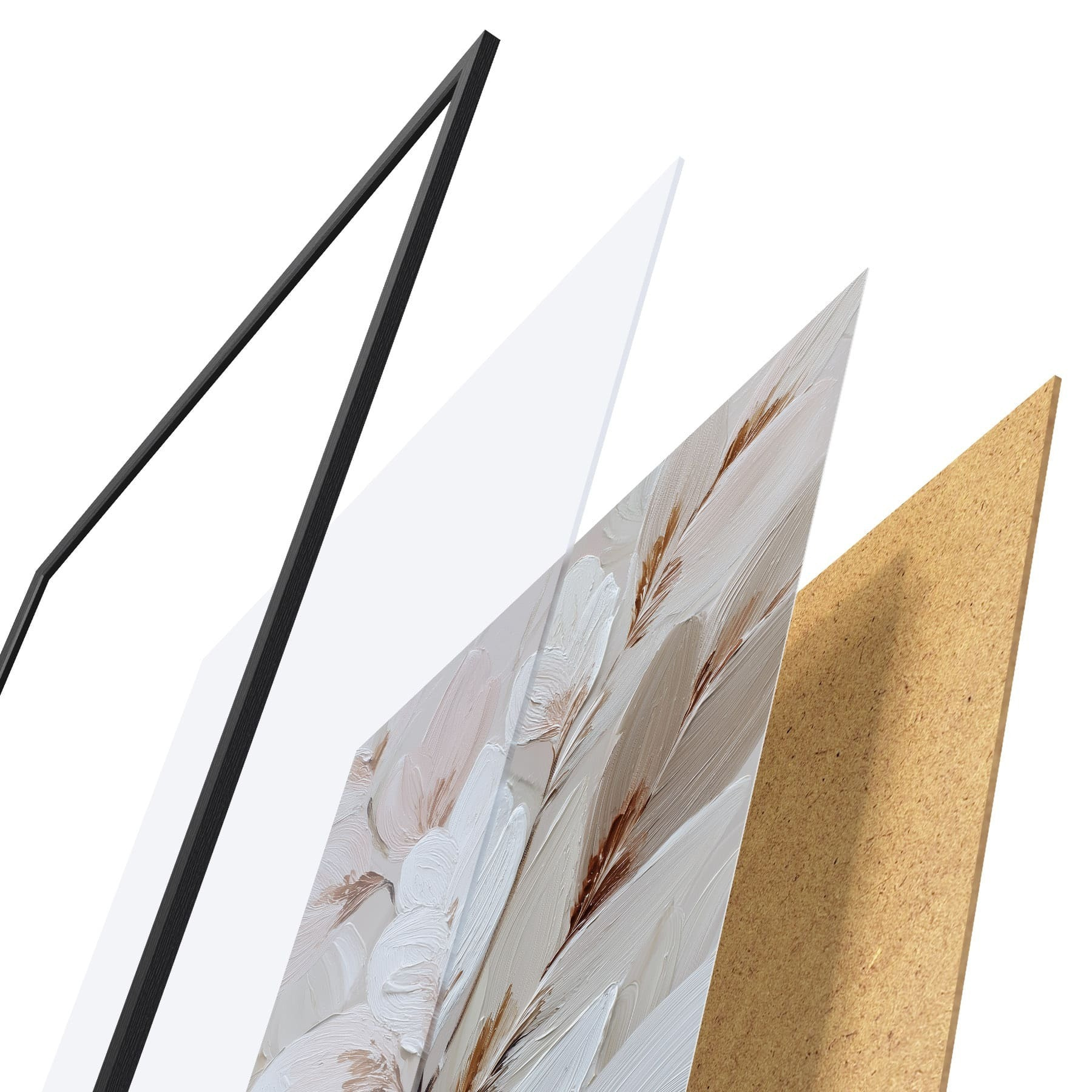 De poster bestaat uit een frame, plexiglas, geprinte afbeelding en spaanplaat achterkant. De poster kan meteen aan de muur worden gehangen dankzij de bevestigingen op de achterkant.
