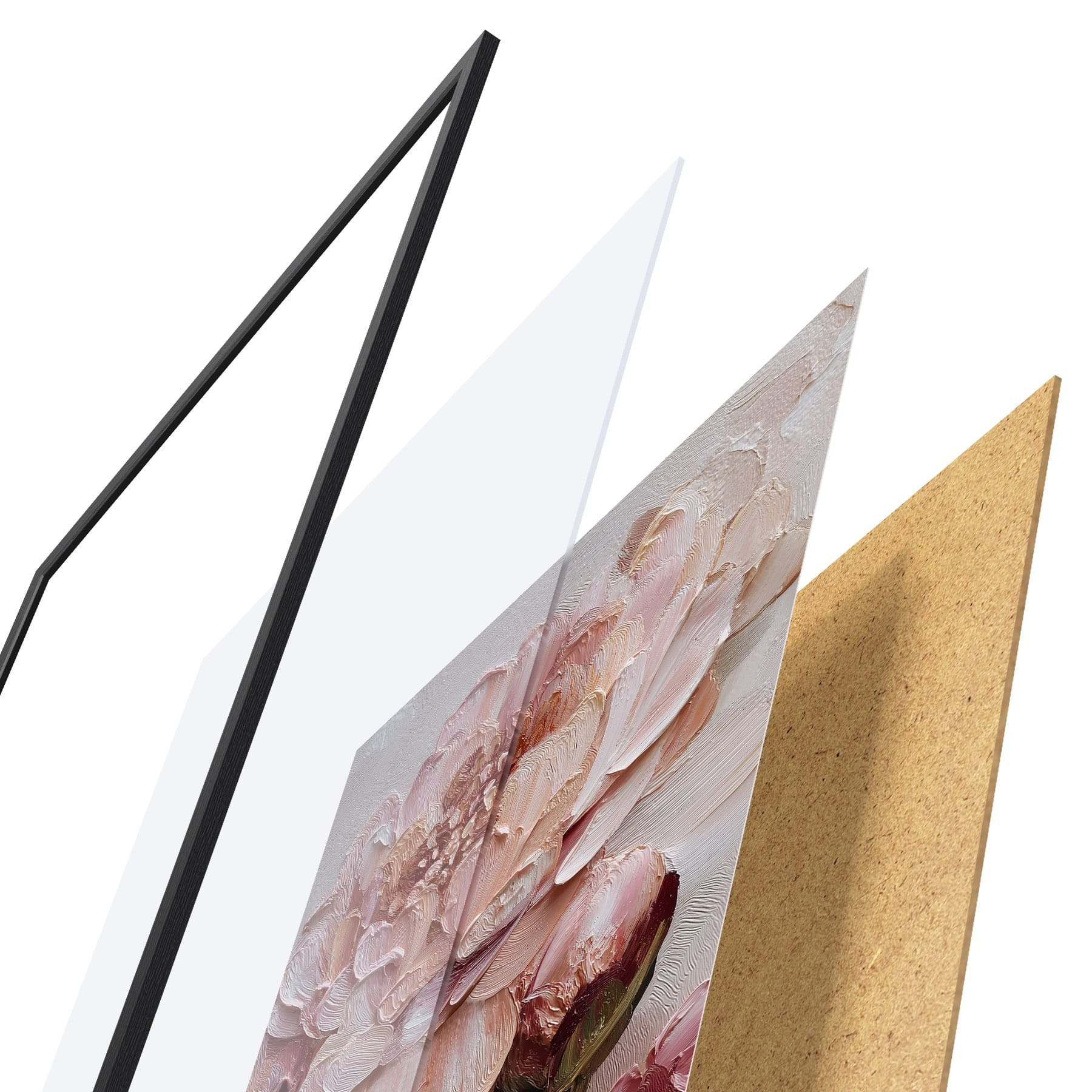 De poster bestaat uit een frame, plexiglas, geprinte afbeelding en spaanplaat achterkant. De poster kan meteen aan de muur worden gehangen dankzij de bevestigingen op de achterkant.